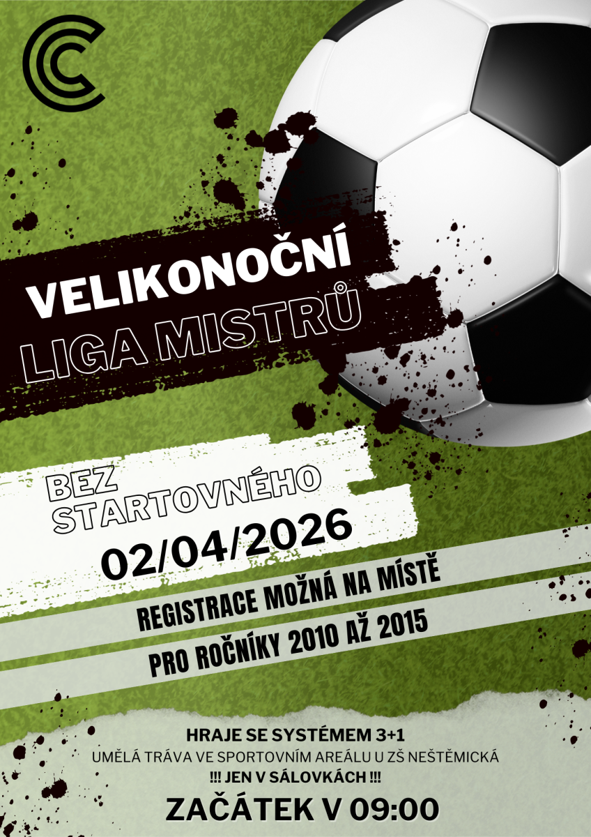 Ve čtvrtek 2.4.2026 jsou velikonoční prázdniny, neseď doma a přijď si zahrát fotbalový turnaj. Turnaj bez startovného, nemusíš být registrovaný. Hraje se na umělé trávě V. generace, ale pozor !!! jen v sálovkách !!!